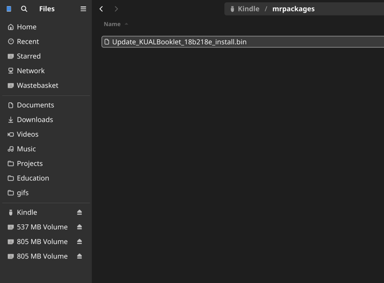 Now, find the Update_KUALBooklet_*_install.bin file and copy it to your Kindle's mrpackages folder
